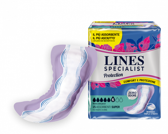 Grazie alla nuova struttura in cellulosa e polimeri super assorbenti che catturano urina e odori, la gamma LINES specialist Protection offre elevata protezione e una sensazione di asciutto e comfort tutto il giorno.