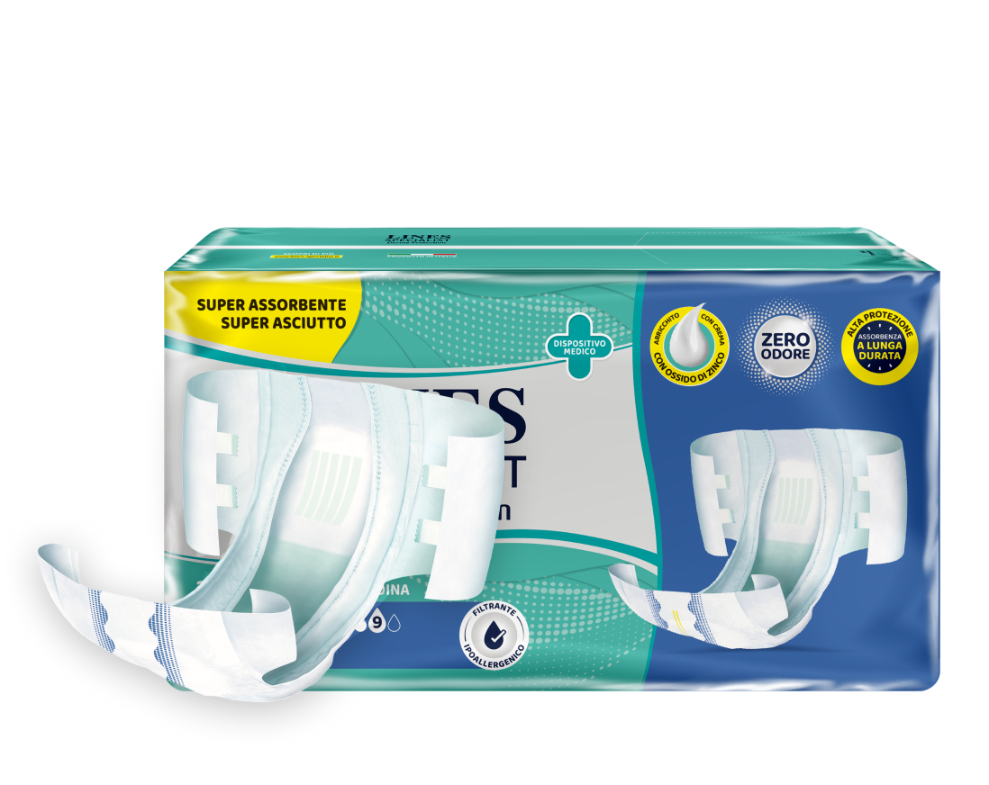 Chiusura in vita mediante adesivi laterali riposizionabili più e più volte per adattarsi alle diverse conformazioni corporee. Chiusura in vita mediante adesivi laterali riposizionabili più e più volte per adattarsi alle diverse conformazioni corporee. -