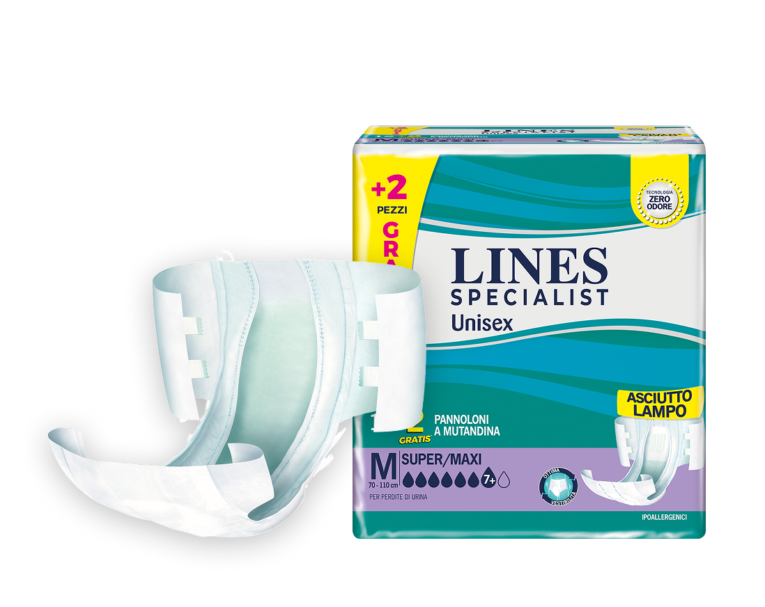 Chiusura in vita mediante adesivi laterali riposizionabili più e più volte per adattarsi alle diverse conformazioni corporee. Chiusura in vita mediante adesivi laterali riposizionabili più e più volte per adattarsi alle diverse conformazioni corporee. -